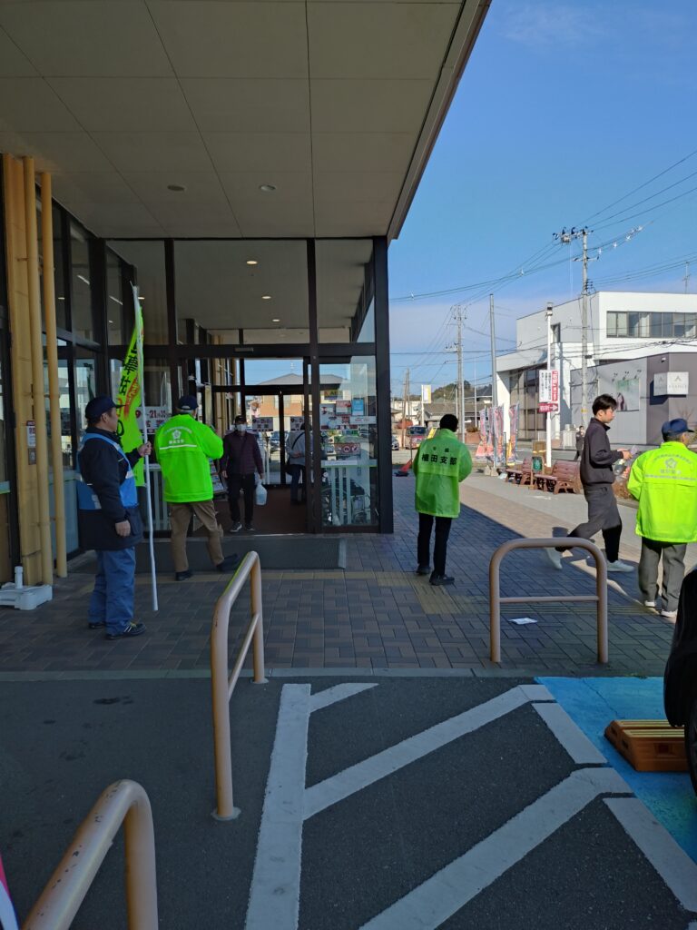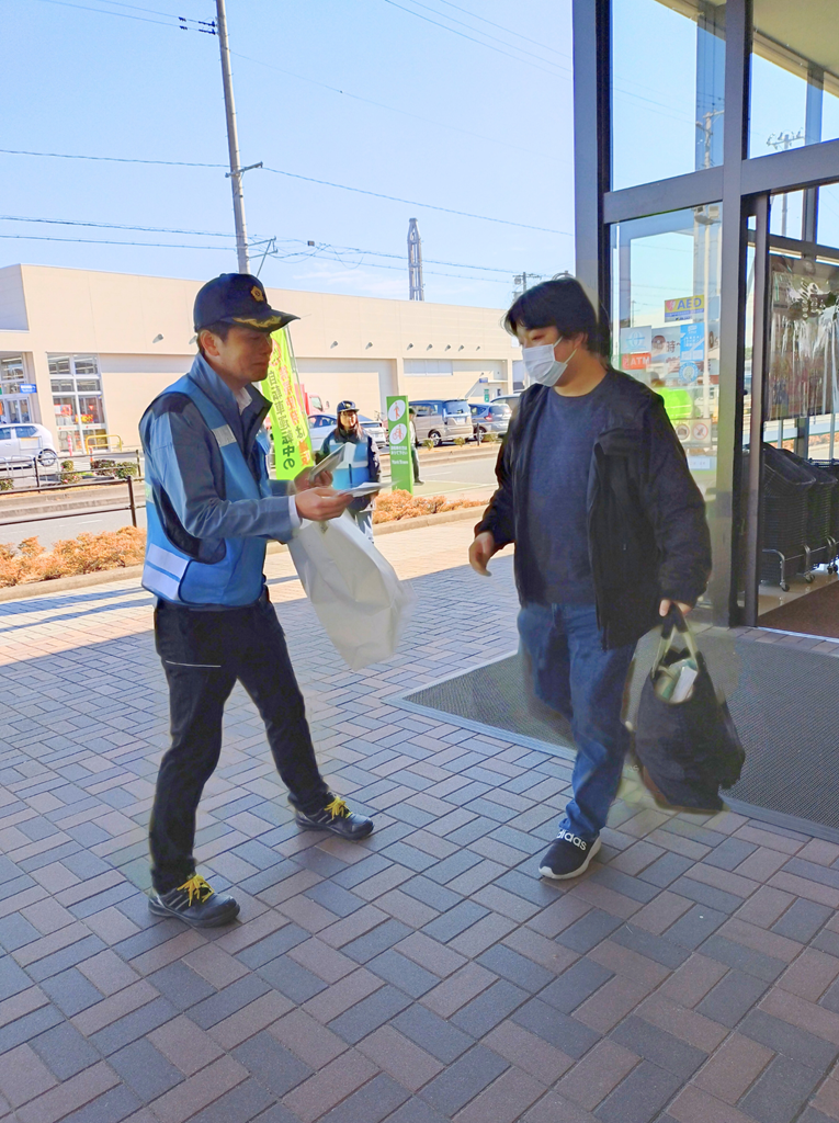 当社では12月9日、ヒーローズアズーレいわきフィールドにおいて実施された、いわき南警察署 年末年始における事件事故防止活動出動式へ参加し、その後の合同キャンペーンにて、交通事故防止および振り込め詐欺防止のチラシ配布を行いました。また12月12日には、広報車による街頭広報を実施し、12月17日には植田支部・火力支部合同キャンペーン(実施場所:ヨークベニマル植田店)にて、啓発グッズの配布などを行いました。(写真は12月17日実施時)